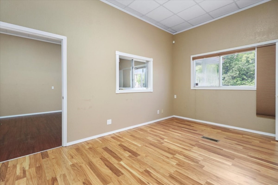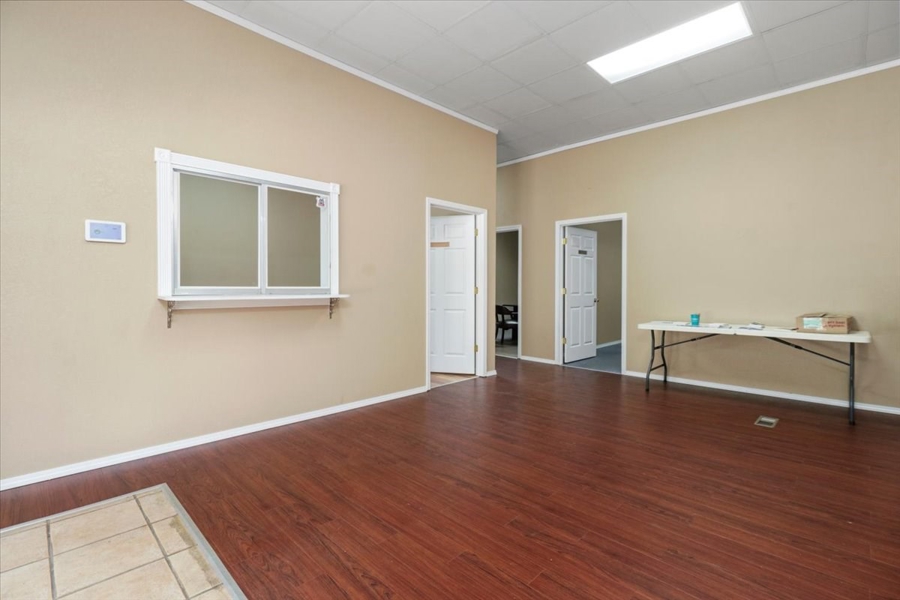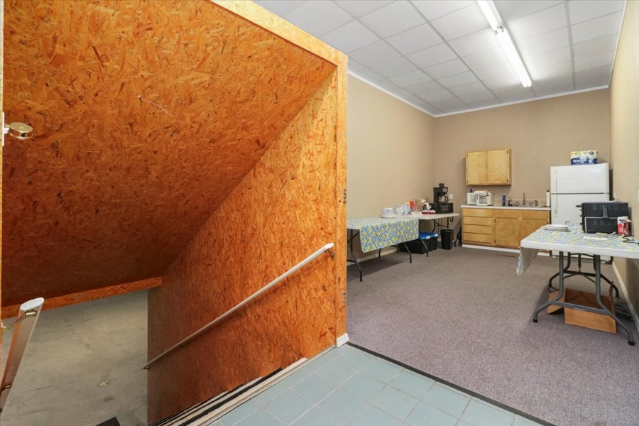 Large Office Space: This space welcomes you with a spacious lobby and reception area, complete with a reception window. This space includes 3-4 private offices, a conference room, a kitchen area break room, and a restroom. The high ceilings create an open and professional atmosphere. Additionally, the unfinished basement, which includes a second restroom, offers plenty of space for expansion or secure storage. The building is also equipped with a security system for added peace of mind.
